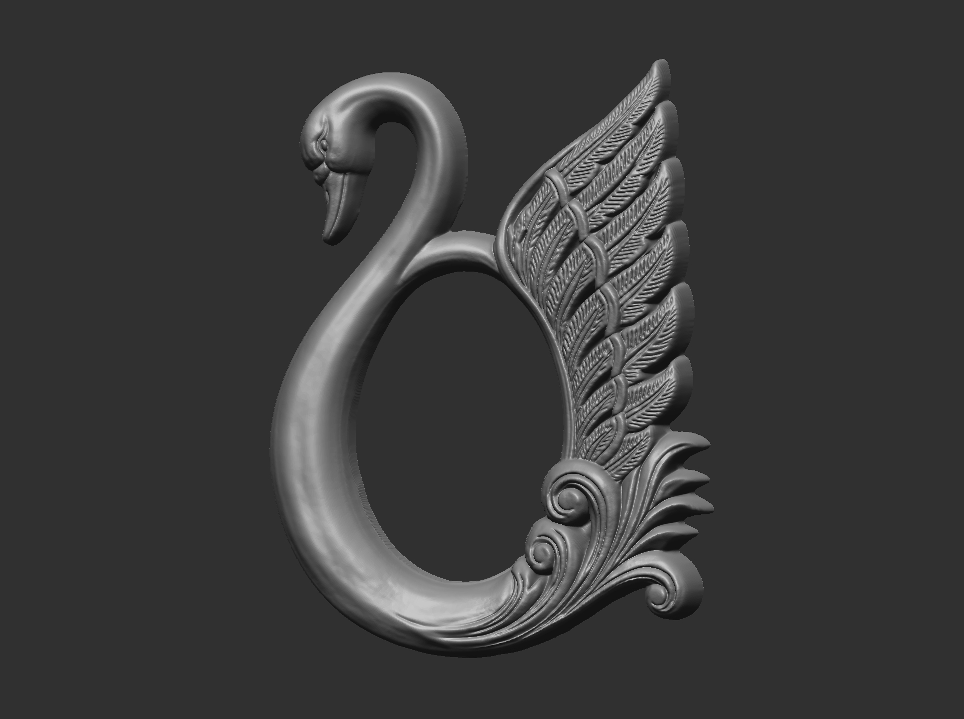 3D model of an ornate swan panel, likely an STL file used for CNC wood carving or 3D printing.
