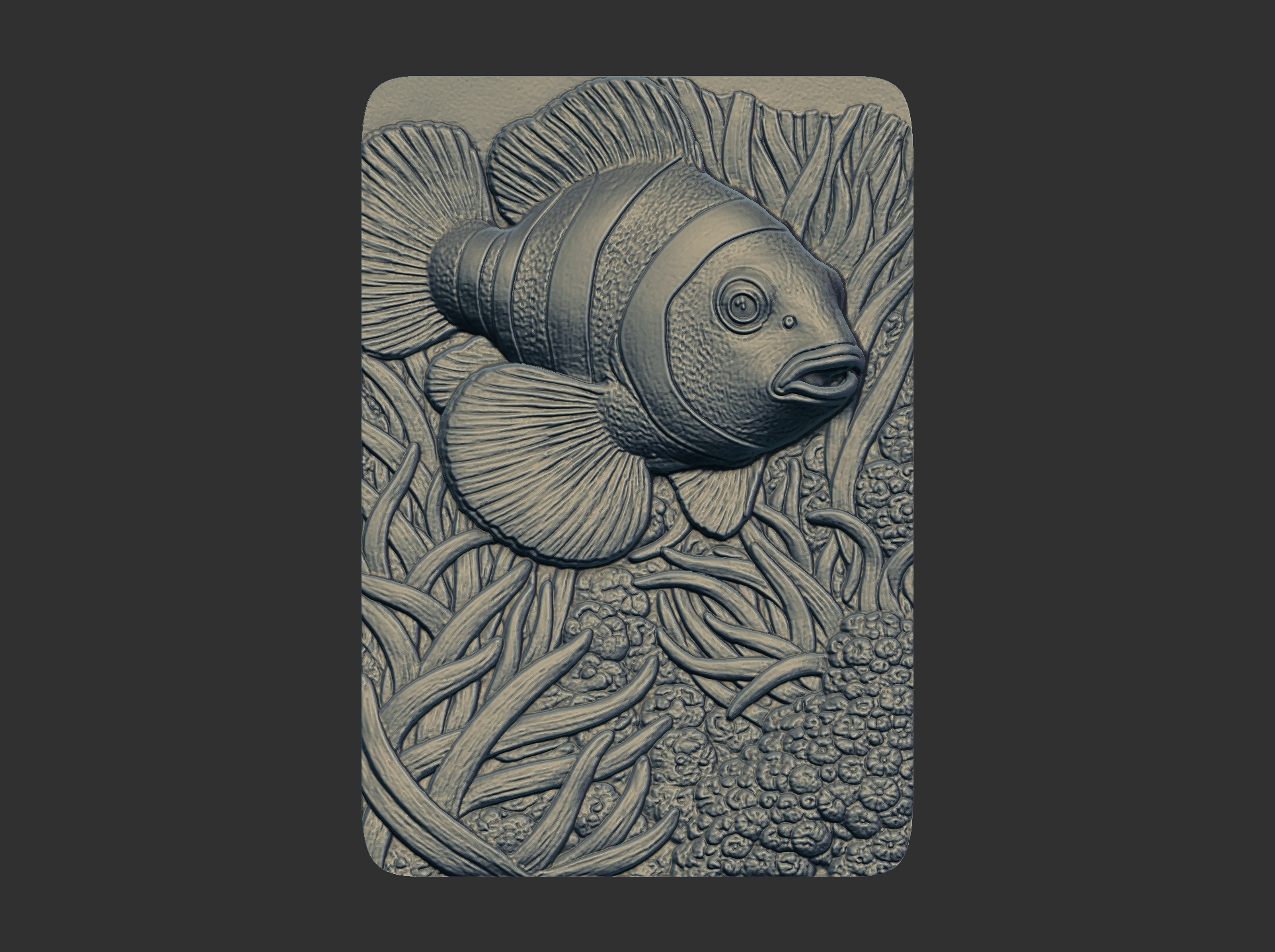 A detailed 3D relief sculpture design of a vibrant clownfish nestled within a dynamic underwater scene of flowing sea grass and textured coral.
