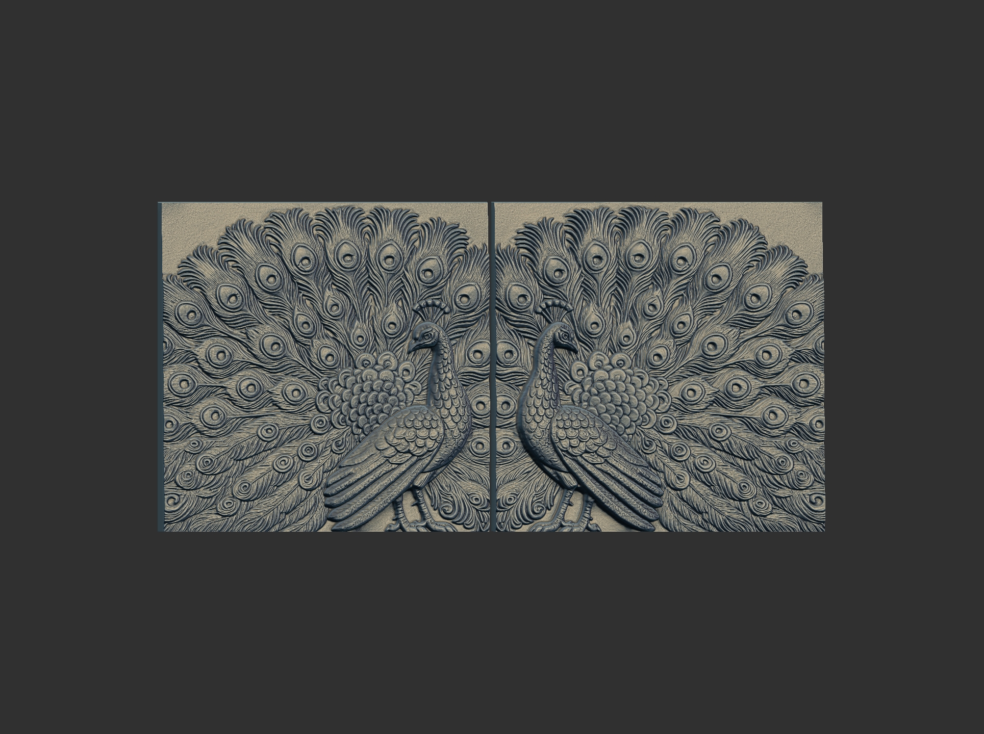 A detailed relief carving featuring two peacocks facing each other with their elaborate fanned tails. The image depicts an ornate, possibly silver or tin, artistic design. This type of design is often used for decorative plates, tiles, or as a basis for laser engraving and 3D printing files.