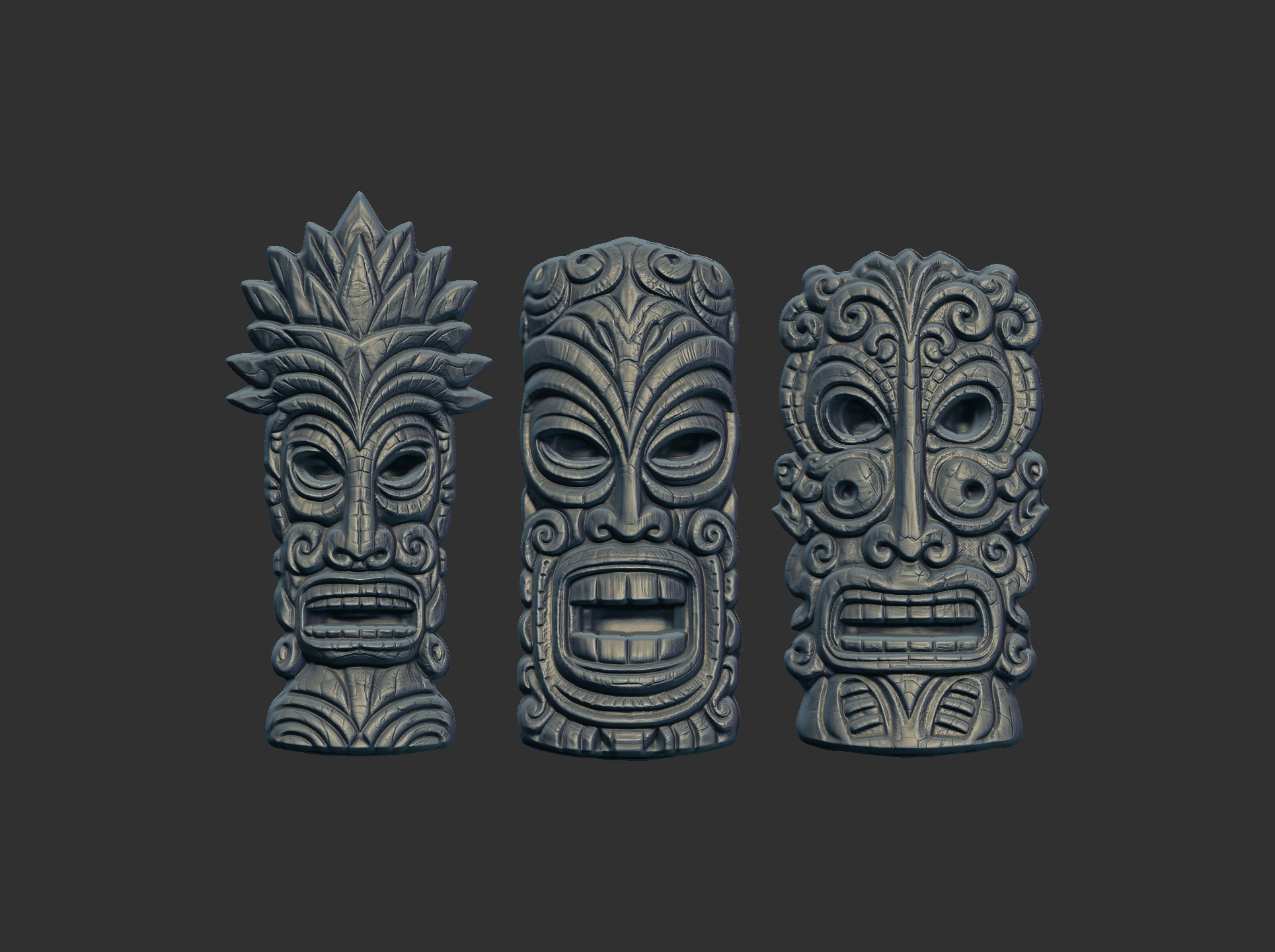 Three Polynesian Tiki Masks 3D Bas-Relief Model