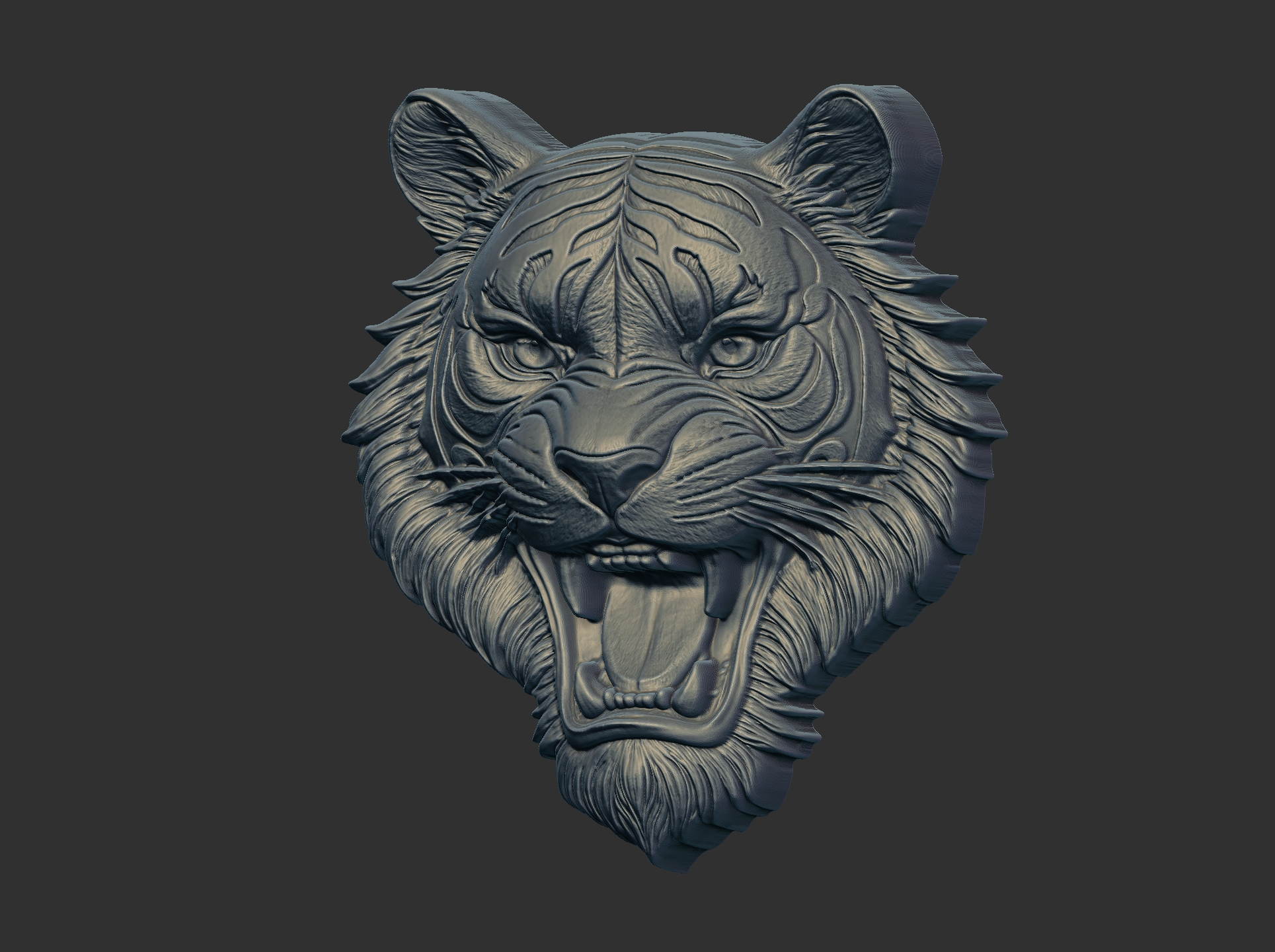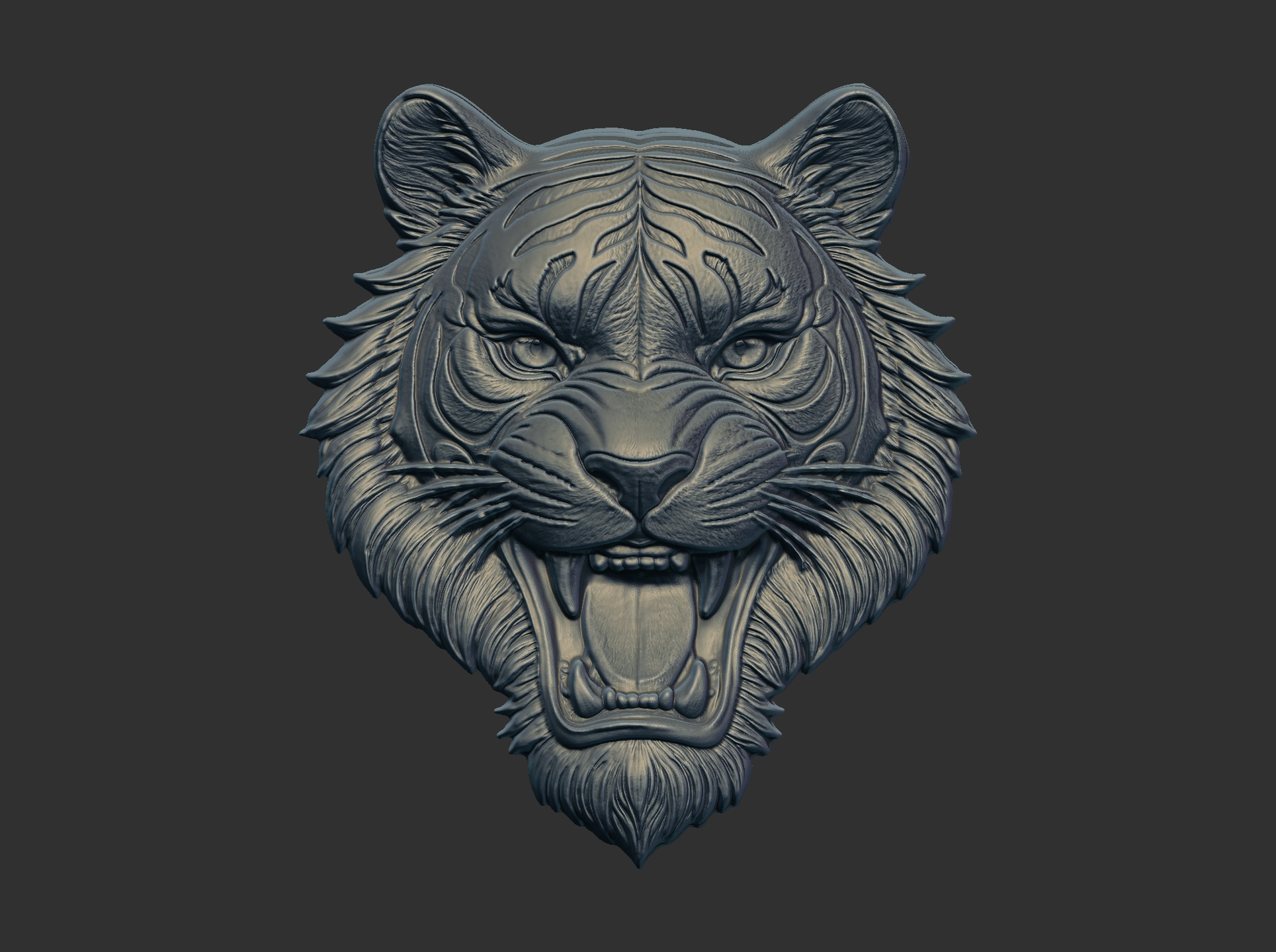 This is a high-poly digital sculpture of a fierce tiger’s head, likely intended to resemble a sculpture or relief carving. The model features an open mouth with bared teeth, conveying a sense of power and intensity. It is designed for use in 3D printing, CNC milling machines, or as a digital asset for various projects.